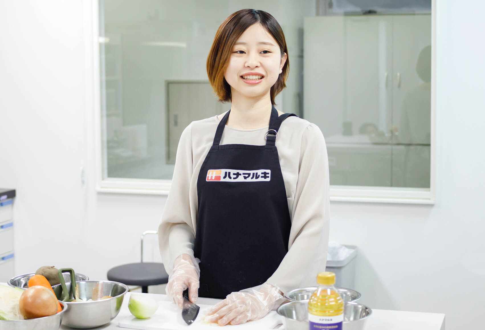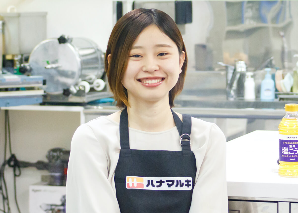 私は小学生の頃から、教師になるのが夢でした。高校時代の家庭科の先生がとても素敵な方だったので、将来は先生と同じ道を歩む夢もありました。しかし、もともと食に関心があり、食品メーカーで仕事をしたいという気持ちが強くなり、ハナマルキに入社。いまは毎日が充実していて、この会社で仕事ができることがうれしいです。思わぬかたちで教壇に立つ夢も叶いました。年に10回程度ある料理教室の仕事で、様々な土地を訪れるのも楽しみです。沖縄は気候風土も違いますし、特に思い出深かったですね。食育もそうですが、今後やっていきたいのは、塩こうじを使った離乳食レシピの開発と提案です。塩分がお醤油より少なく、塩こうじは麹と塩、水を混ぜて発酵させたものなので安心です。その他の様々な分野でも、液体塩こうじを広めていきたいです。
