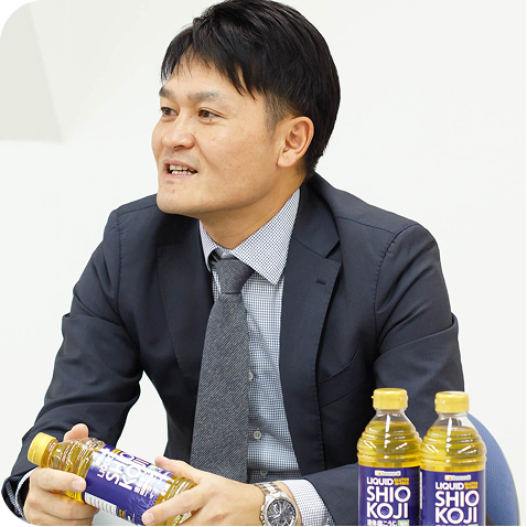 入社以来、家庭用商品の営業一筋。発売当初はバイヤーとの商談も苦労の連続だった。液体タイプではない、粒タイプの塩こうじの色は「白」だが液体塩こうじの液色は「ゴールド」。液体塩こうじを見て「これが塩こうじ?色が違う」という反応が多く、当初は説明に時間を要した。また「粒タイプの塩こうじと変わらないからいらない」と言われることも。浸透力や使い勝手の良さなど、液体だからこその特長は数多くあるのだが、導入を実現するのはそう簡単なことではない。提案に行き詰った時にヒントを得ていたのが、社内の部署横断で実施している「塩こうじ会議」。この会議では参加者全員で塩こうじをどう提案していくかを議論する場で、現在も続いている。目標は液体塩こうじをどの家庭にも1本ある調味料にすること。それだけの商品だと思う。バイヤーに何度でも説明を繰り返す。諦めはしない。先日、長く提案を続けたお客様に液体塩こうじを採用いただいた。うれしかった。だが、量販店、スーパーへの採用率100%を目指す彼にとってはあくまでも通過点だ。