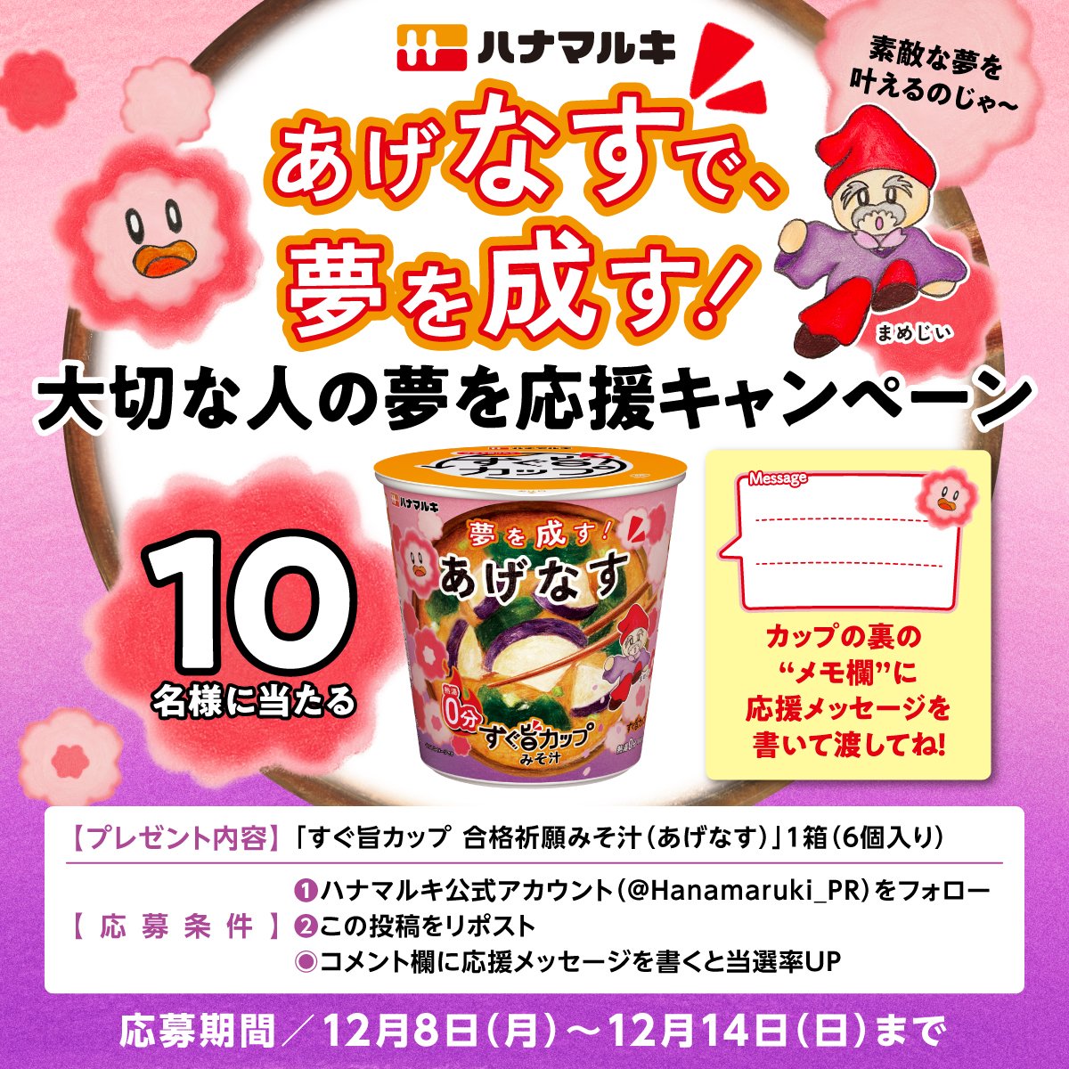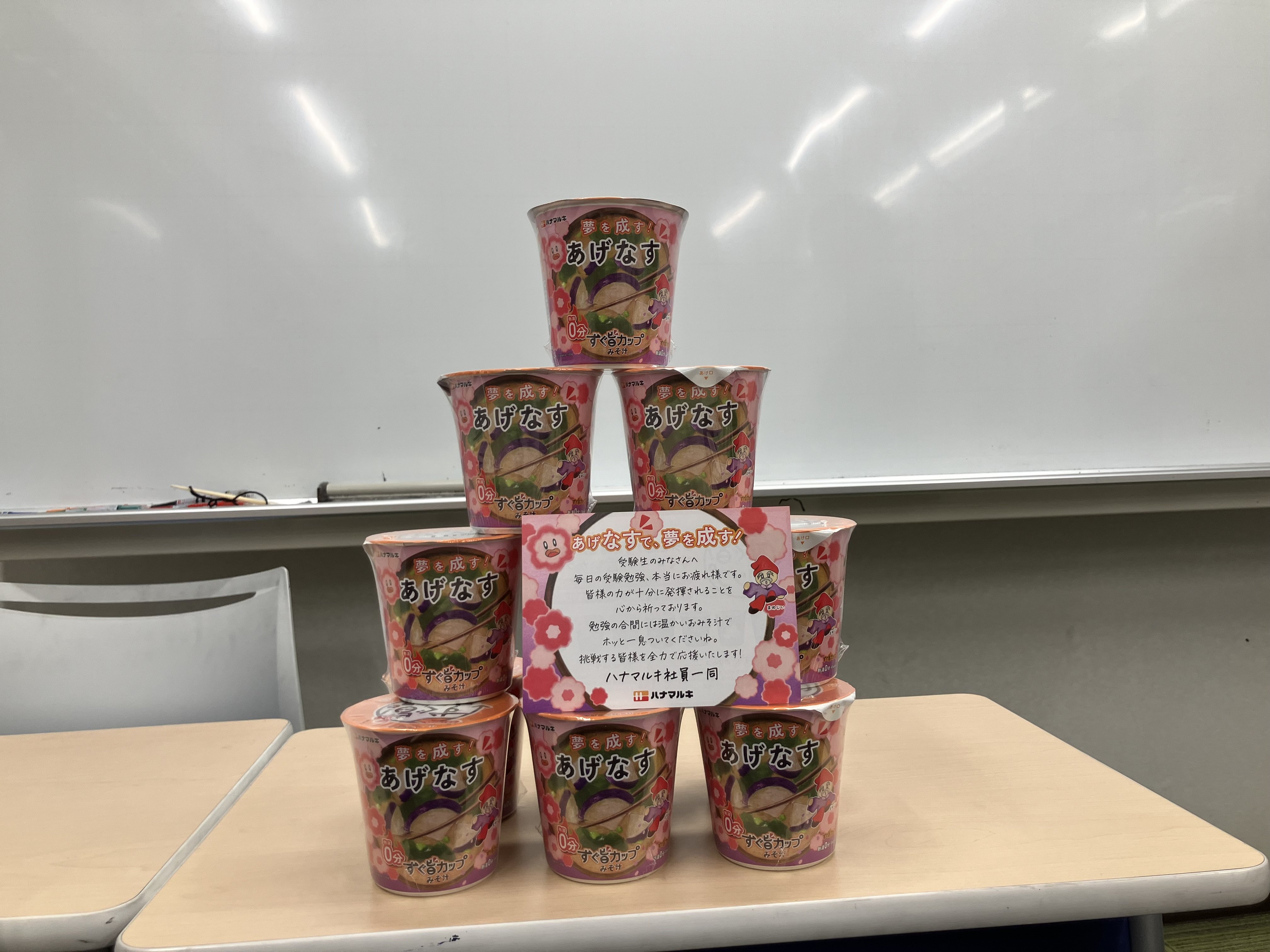 味噌・醸造製品メーカーのハナマルキ株式会社(本社:長野県伊那市、代表取締役社長:花岡周一郎、以下当社)は、当社の即席みそ汁ブランド「すぐ旨カップみそ汁」シリーズより、人気No.1フレーバー「あげなす」を、受験生応援の期間限定デザイン「すぐ旨カップ 合格祈願みそ汁」として、2025年11月下旬より出荷開始しました。また、総合進学塾の臨海セミナーグループ(本社:神奈川県横浜市、代表取締役社長:佐藤博紀、生徒数73,074名※2025年9月現在)にて、今回は大学受験科の高3生を対象に本商品のサンプリングを実施いたしました。