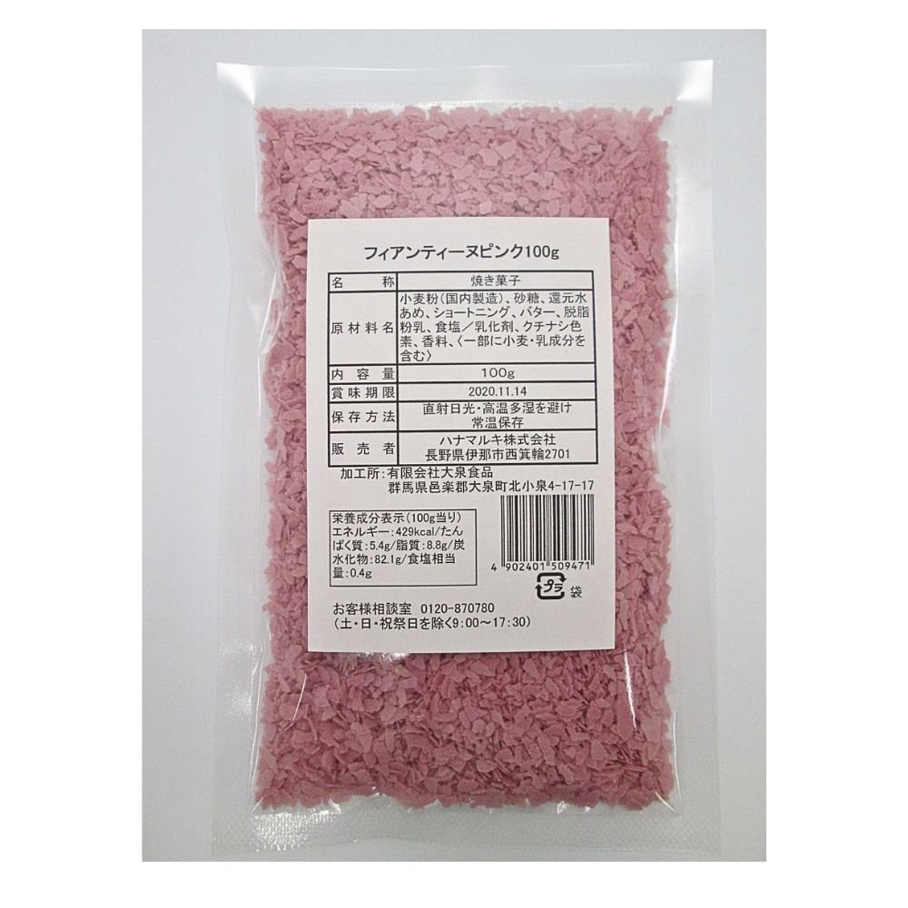 サクサクした軽い食感に焼き上げた生地を使いやすいフレーク状にしました。クチナシから抽出した色素で鮮やかなピンク色に仕上げました。店舗調理で使いやすい100gの個包装タイプです。