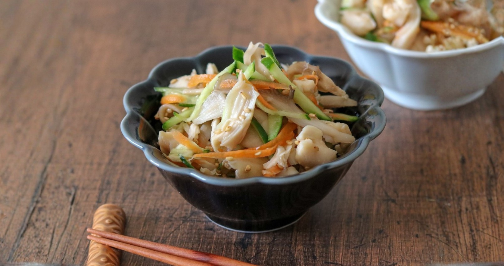 - きゅうりは幅3㎜の斜め薄切りにした後、数枚を重ねて斜め細切りにする。人参は皮をむき、スライサーなどで細切りにする。