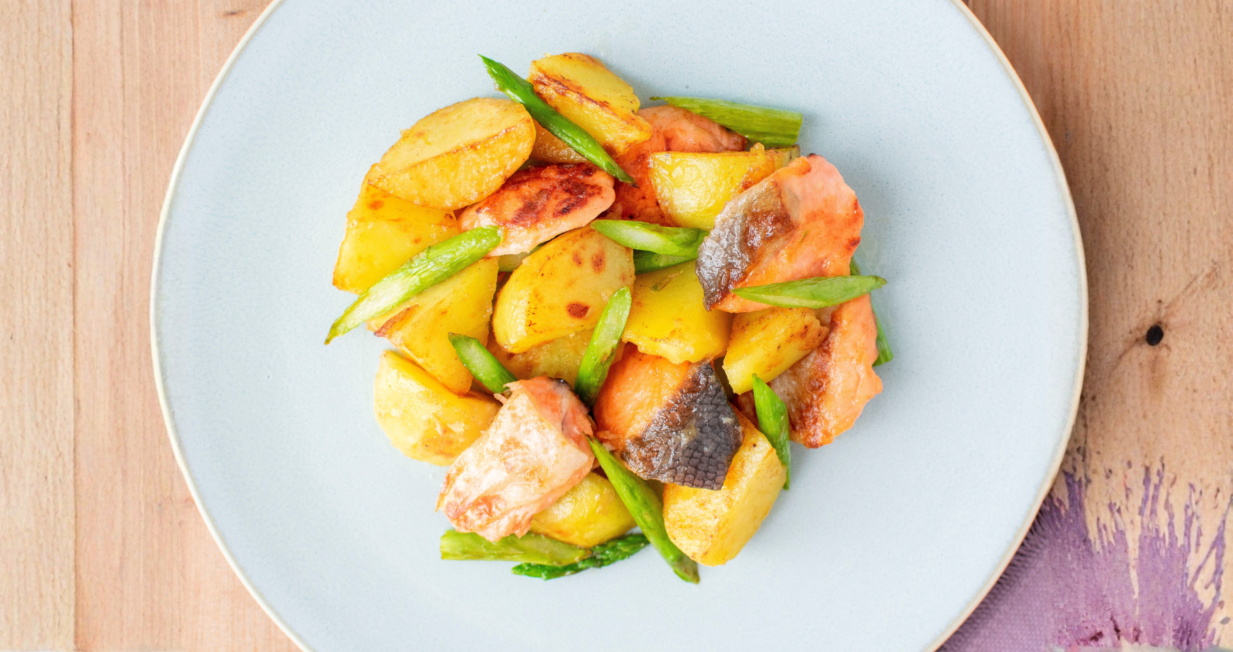 - 鮭を裏返し、アスパラガスを加えてさらに2分焼く。じゃがいもは時々向きを変えながら全体に焼き色をつける。