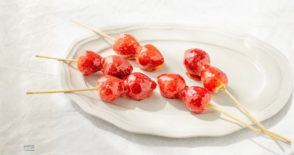 - 水飴が固まることが確認できたら、手早くいちごに絡めていく。