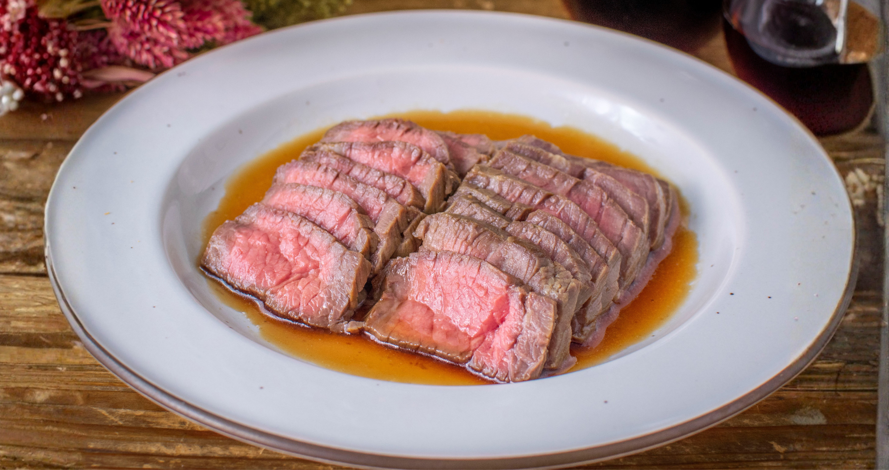 加熱すると硬くなりやすい牛モモ肉ですが、液体塩こうじに漬けこむことで加熱しても柔らかく仕上がります!
