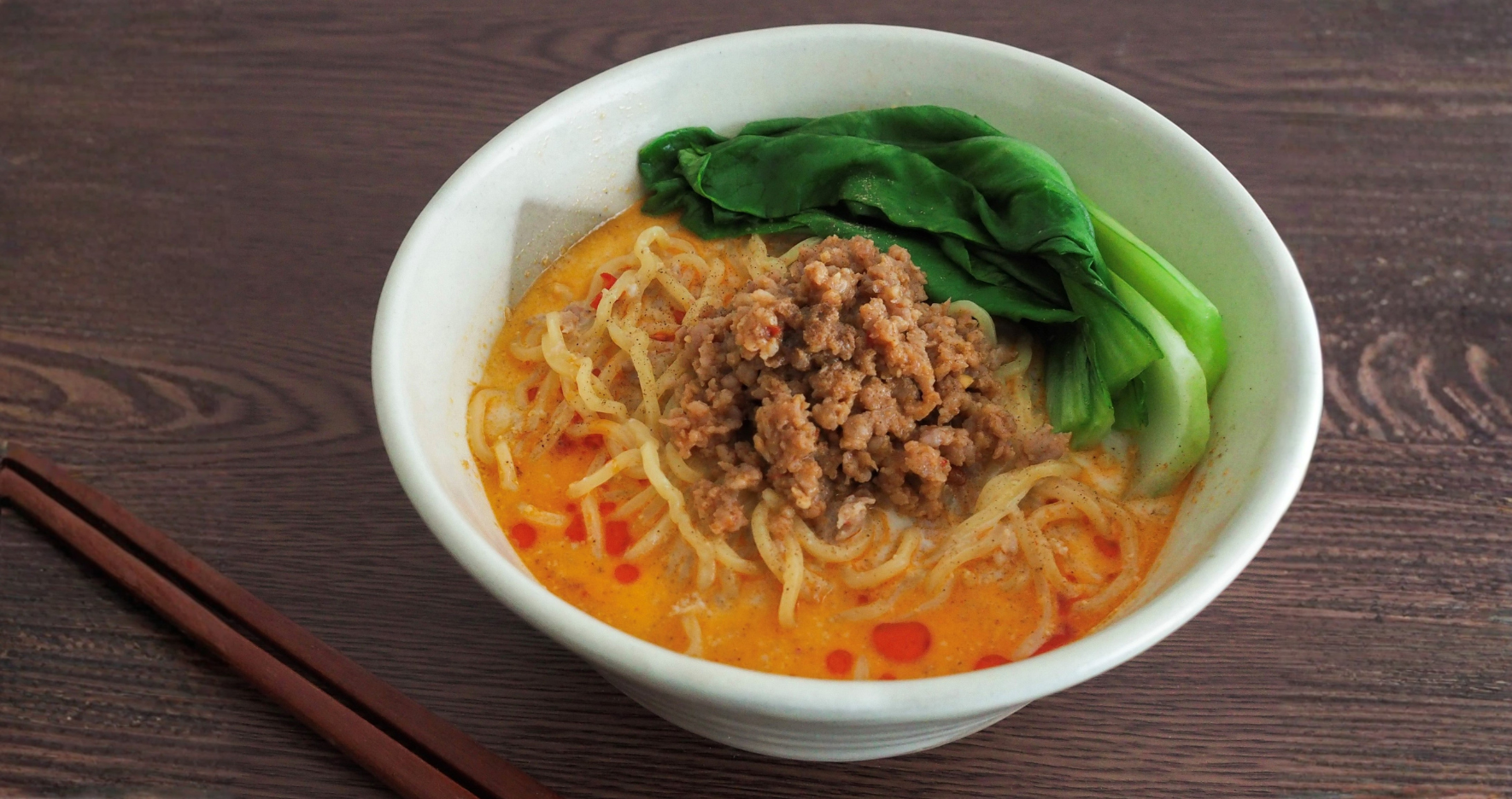 - ④に水気を切った中華麺を入れ、②とチンゲン菜をのせる。お好みでラー油をかける。