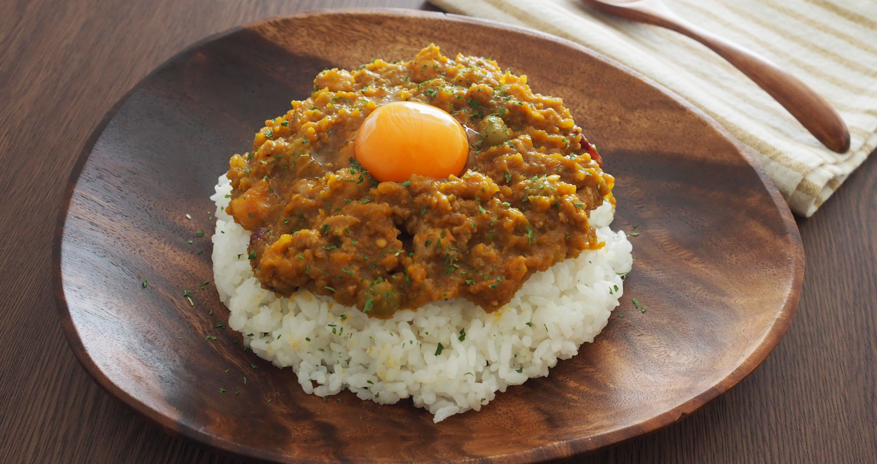 - 皿にご飯を盛り、⑧をかけ、卵黄をのせる。