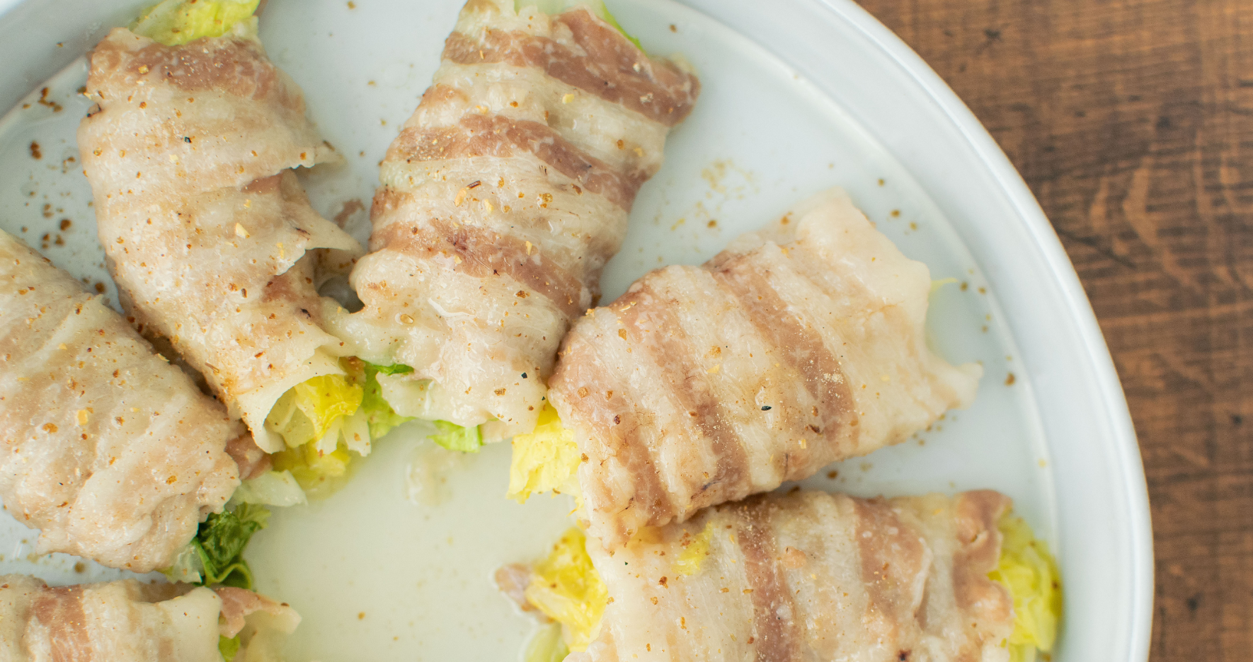 白菜を豚肉で巻くとき、きつくめに巻くと、加熱しても崩れにくくなります。
