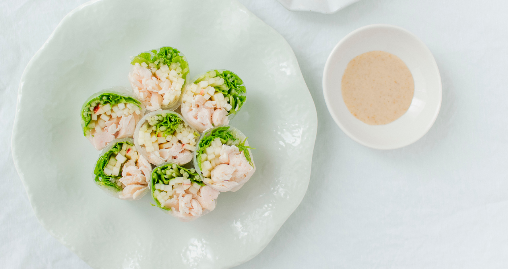 - 水でふやかしたライスペーパーを広げ、手前中央にりんご、水菜、ささみを揃えてのせる。具材を包むように巻く。