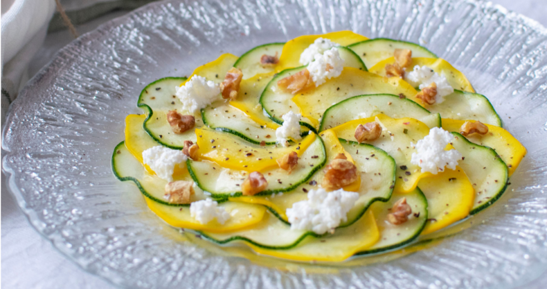 - 器にズッキーニを並べ、オリーブオイルを回しかけ、カッテージチーズ、くるみ、ブラックペッパーの順にかける。