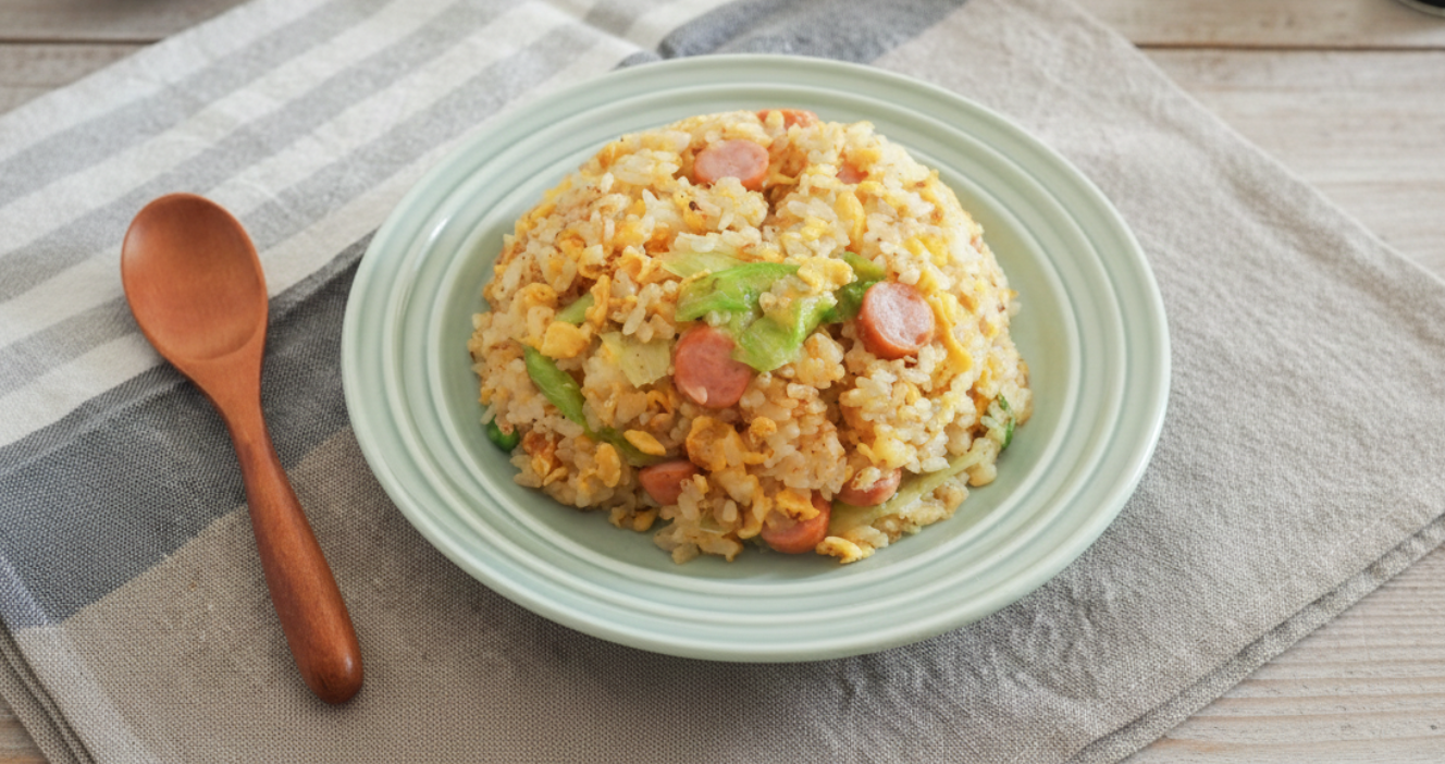 - 輪切りにしたソーセージ、ちぎったレタス、中華こうじを加えてさらに炒め、こしょうで味を調える。